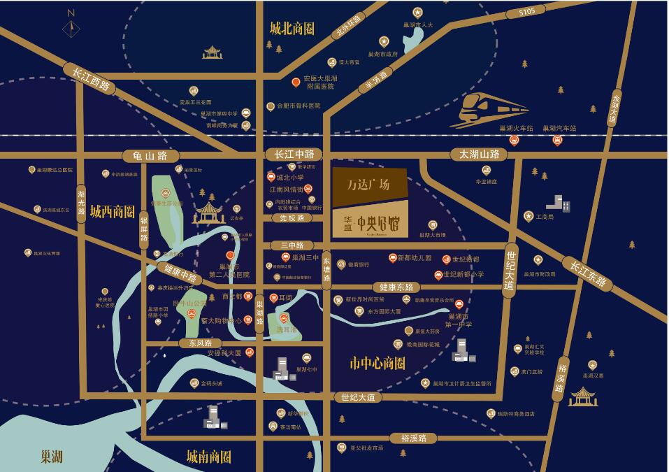 华盛•中央公馆:华盛•中央公馆是由乐动在线开发建设的位于巢湖的首个高端项目,项目位于东塘路与长江中路交口(向南200米),万达广场南侧,总用地面积约54亩,绿化率40%。该项目毗邻巢湖最大的商业综合体巢湖万达广场,真正的主城心,繁华里。项目周边交通便利,长江中路、世纪大道环绕,优质学校、医院、菜市场等生活配套齐全,让业主畅享繁华都市生活。